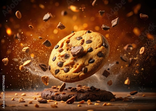 Slow Motion Explosion of Chocolate Chip Cookies - Captivating Drone Photography of Delicious Treats in Mid-Air Action, Perfect for Food Lovers and Dessert Enthusiasts