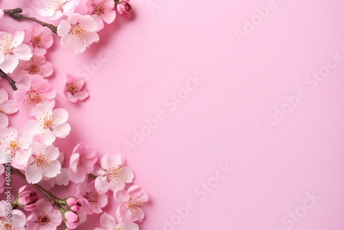 Small beautiful flowers blossom on pastel background with copy space. Floral pattern layout with a lots of place for adding text Generative AI