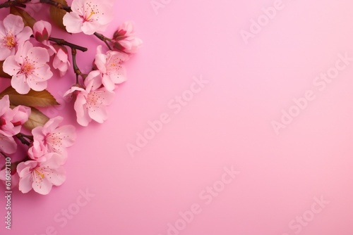 Small beautiful flowers blossom on pastel background with copy space. Floral pattern layout with a lots of place for adding text Generative AI