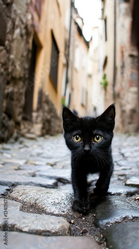Small black kitten standing on cobblestone street with rustic buildings in the background