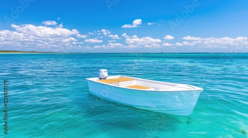 Small boat floats on calm turquoise ocean, under blue sky with clouds; idyllic tropical seascape, perfect for travel brochures