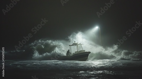 Small boat in stormy sea rescuing person from water, spotlight illuminates rescue action, waves crashing, urgent and relieved reaching for help.