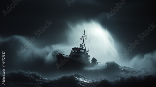 Small boat in stormy sea rescuing person from water, spotlight illuminating rescue mission amidst crashing waves.