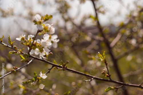 small branch of a blossoming cherry tree with small flowers in the garden on a blue blurred background