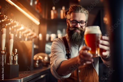 Small Business Male Owner Pouring Signature Brew in Futuristic Craft Brewery/ Generative AI.