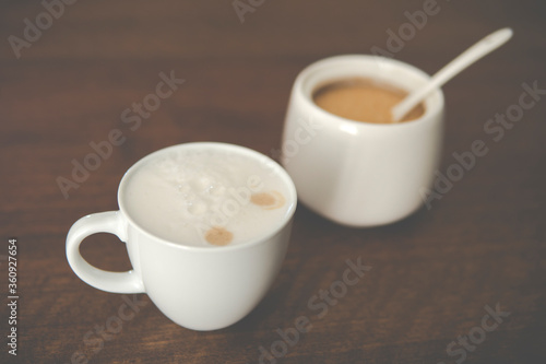 foam, cappuccino, hot drink, cane, sugar, view, up high, cream, cafeteria, spoon, hot, sugar bowl, china, old, white, table, espresso, beverage, cup, mug, breakfast, drink, empty, liquid, cafes, milk, break, caffeine, latte, mocha, fresh, food, colours, background, wooden, tabletop