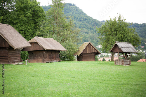 small cute vintage rural alpine cabins with thatched roofs on a green lawn