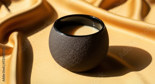 cup, mug, beverage, drink, liquid, cream, hot drink, tea, latte, smoothie, cocktail, food, dessert, snack, fabric, silk, satin, textile, drapery, fold, texture, dark, gold, background
