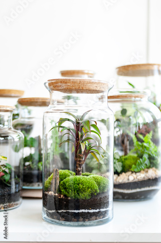 Small decoration plants in a glass bottle/garden terrarium bottle/ forest in a jar. Terrarium jar with piece of forest with self ecosystem. Save the earth concept. Bonsai