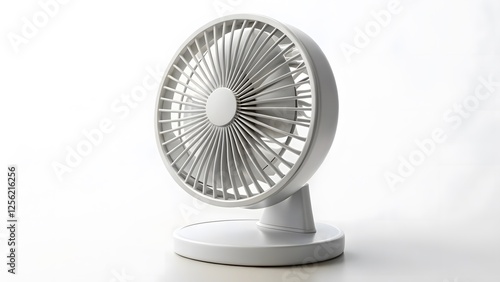 fan, desk, small, white, portable, cooling, appliance, device, contraption, technology, home, office, air, ventilation, breeze, summer, heat, climate, control, electric, motor, blade, plastic, modern, simple, minimalist, design, circular, round, footed, racked, compact, efficient, quiet, whisper, silent, power, energy, buttons