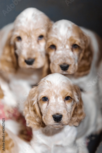 small dog, cute purebred English Cocker Spaniel puppy on breeding station, descendants of European champions.