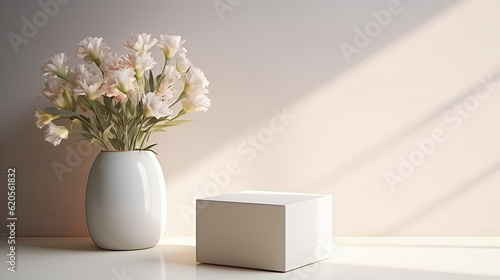 Small gift jewelry box mockup. Flower vase on background