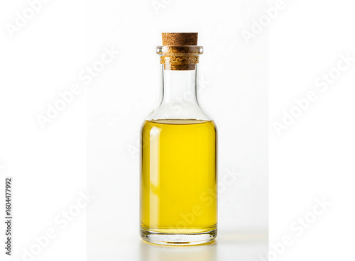 Small glass bottle filled with golden yellow liquid and cork stopper