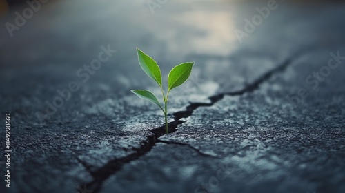 Small green plant growing out of crack in asphalt road. Environmental problems, urbanization, hope and new beginnings