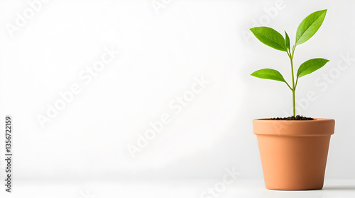 Small green sprout in terracotta pot on white background perfect for eco campaigns, gardening blogs, startup visuals or educational posters. Selective focus