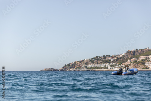 Small motorboat of blue color moored in the sea near a beach