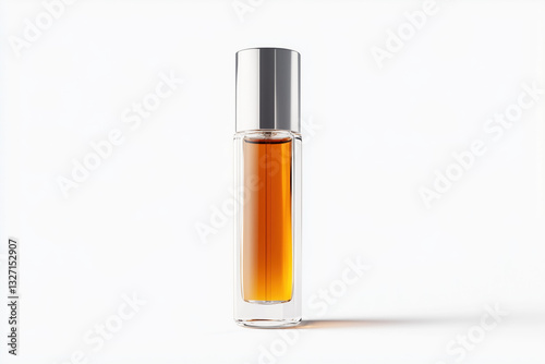 Small perfume roller bottle with metallic rollerball applicator against a white background