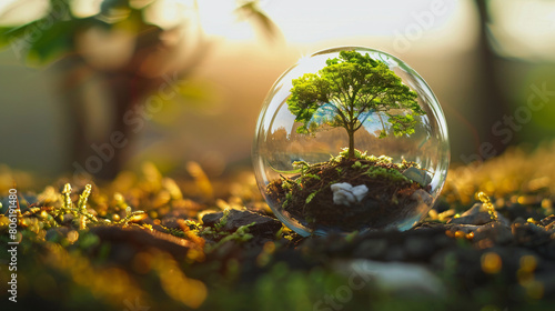 small plant growing glass globe blur background copy space