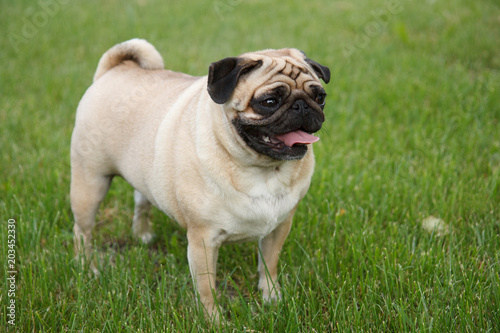 pet, dog, pug, animal, grass, puppy, cute, domestic, green, young, funny, 1, small, mammal, looking, lawn, garden, wrinkly, standing