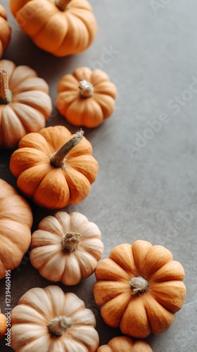 Small pumpkins arranged on a gray surface before autumn festivities begin in a cozy home setting