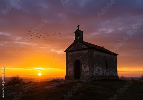 Small stone chapel silhouetted against a vibrant sunset sky with birds flying