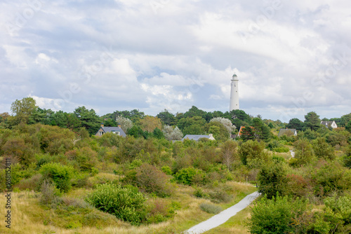 Small town houses between dune with white lighthouse, The south tower (Zuidertoren), Schiermonnikoog is a municipality and national park in the Northern Netherlands and one of the West Frisian Islands