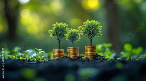 Small trees emerging from piles of gold coins set against a lush green background symbolizing financial growth investment wealth prosperity sustainability and money saving strategies