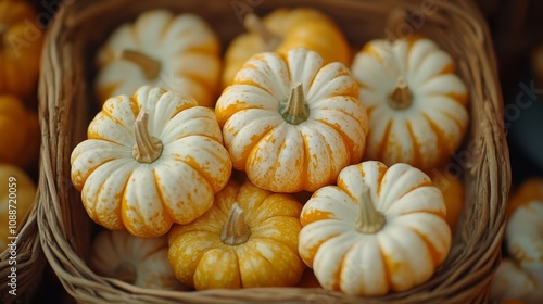 pumpkin, pumpkin, gourd, gourd, fall, autumn, harvest, orange, white, yellow, wicker, basket, brown, stem, nature, produce, vegetable, food, closeup, detail, texture, rustic, decor, decoration, seasonal, still life, arrangement, background, pattern, organic, ripe, fresh, round, smooth, vibrant, natural, cosy, festive, home, table, centrepiece
