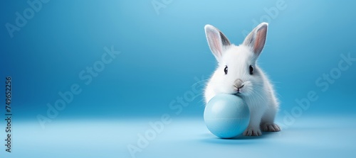 small white rabbit with blue ball pet pictures, in the style of pastel colors, toyen, nikon af600, light crimson and sky-blue, eastern brushwork, kurzgesagt, hatching