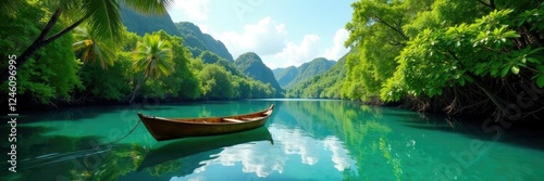 Small wooden boat docked in a tranquil mangrove cove, small boat, calm