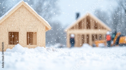 Small wooden house structure on a snowy construction site, with snowfall and blurred workers in the background.