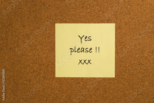 Small yellow sticky note on an office cork bulletin board with the message yes please