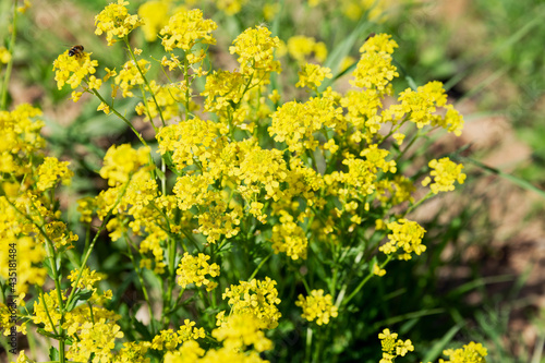 Small yellow wildflowers on a sunny summer day. Soft focus.