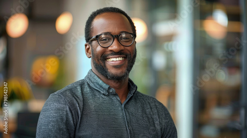 Smart and successful black man wearing casual clothes and glasses smiling warmly in blurred modern office space