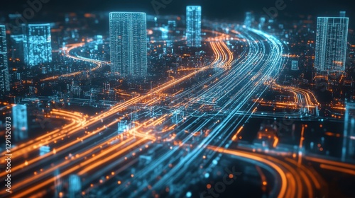 Smart city AI network, futuristic digital connection, urban technology, glowing roads and data streams,