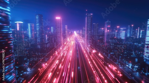 Smart city with speed line glowing light trail surround the city. big data connection technology concept