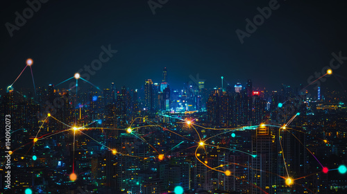 Smart digital city with connection cyber security network reciprocity over the cityscape . future smart wireless digital city and social media networking systems that connects people within the city