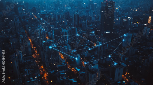 Smart digital city with connection cyber security network reciprocity over the twilight cityscape.future wireless digital city and social media networking systems that connects people within the city