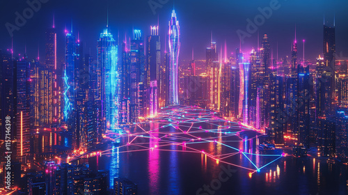 Smart digital Innovation city with connection network reciprocity over the cityscape. of future smart wireless digital city and social media networking systems that connects people with in city