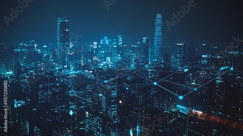 Smart digital Innovation city with connection network reciprocity over the cityscape. of future smart wireless digital city and social media networking systems that connects people with in city