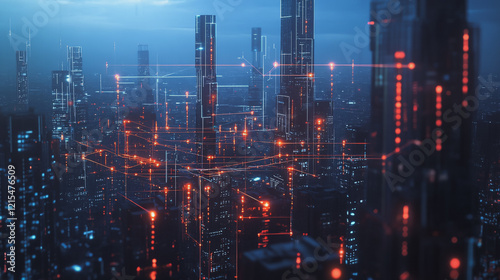 Smart digital Innovation city with connection network reciprocity over the twilight cityscape. of future smart wireless digital city and social media networking systems that connects people with city