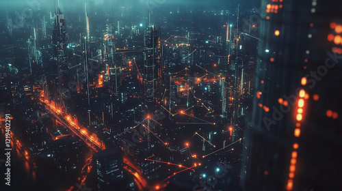 Smart digital Innovation city with connection network reciprocity over the twilight cityscape. of future smart wireless digital city and social media networking systems that connects people with city