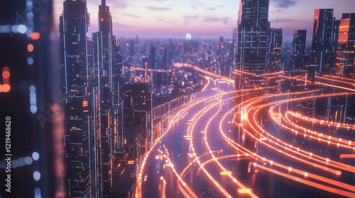 Smart digital Innovation city with connection network reciprocity over the twilight cityscape. of future smart wireless digital city and social media networking systems that connects people with city