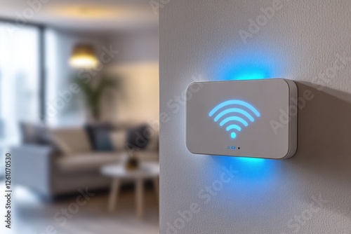 wi-fi, wireless, technology, smart, home, device, cyberspace, network, connectivity, digital, modern, interior, design, house, apartment, living, room, wall, signal, electronic, contraption, innovation, automation, control, system, lighting, blue, white, square, rectangular, glowing, illuminated, energy, power, communication, future, connection