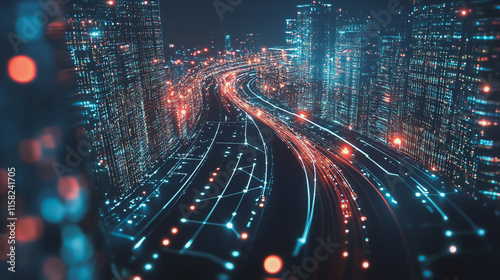 Smart Innovation city with connection cyber security network reciprocity over the night cityscape future wireless digital city and social media networking systems that connects people in the city