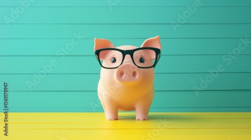 money box, goggles, smart, savings, money, finance, financial, wealth, investment, budget, planning, economy, cute, adorable, pink, pig, animal, table, yellow, background, teal, wood, texture, concept, idea, illustration, graphic, design, image, photo, picture, business, success, prosperity, future, security, retirement, goal, objective, wise, responsible, saving money, personal finance