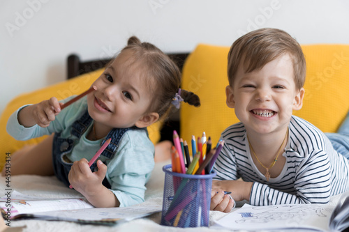smart smiling preshool toddler children boy and girl draw with pencils lying on their stomach at yellow bed. little cute reader have fun, happy kid on quarantine at home. Friendship, family, education