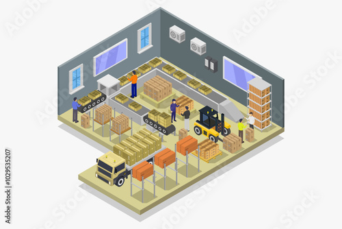 illustration, logistic, industrial, transportation, warehouse, transport, technology, isometric, business, package, delivery, cargo, shipping, three-dimensional, smart, distribution, service, process, vector, design, network, truck, concept, shipment, management, system, storehouse, factory, storage