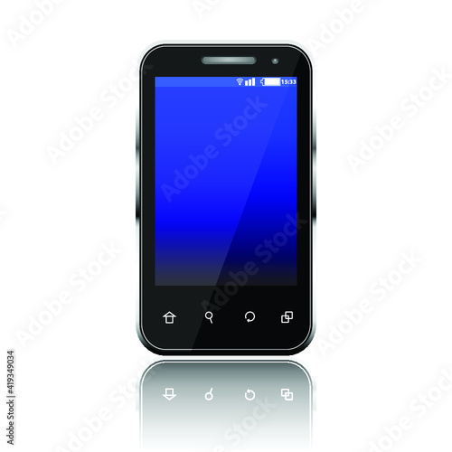 Smartphone Mockup Design Vector. Black Modern Trendy Mobile Phone With Blue Screen Front View. Isolated On White Background