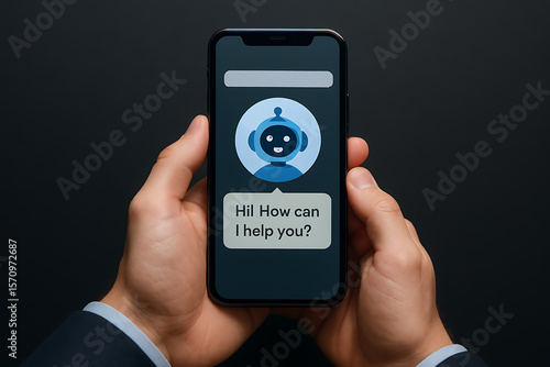 Smartphone screen displaying ChatGPT-style AI bot interface with smiling blue robot avatar saying "Hi! How can I help you?", symbolizing virtual assistant and user-friendly AI support